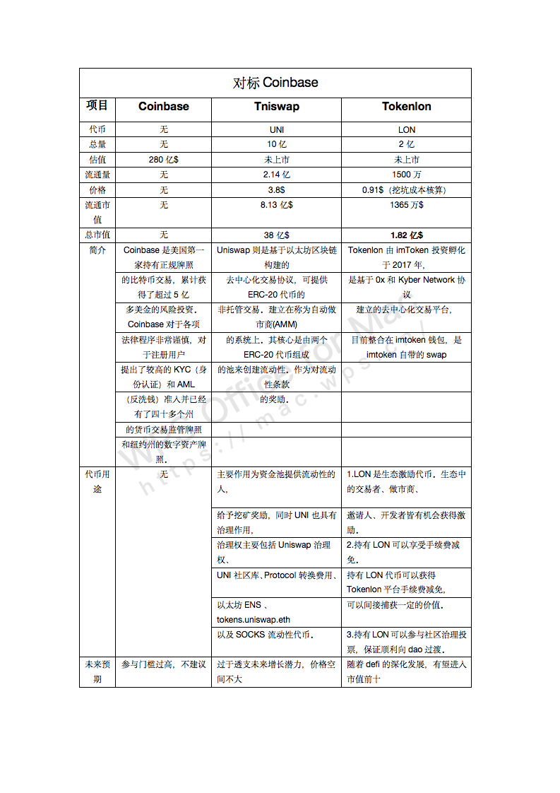 如果按照同类交易所的估值,Tokenlon交易额是Uniswap的1/5-1/10,Uniswap估值为8亿美元,LON初始流通量2480万(其中一部分是做市商锁仓,还有1500万是空投暂未确定投放方式),保守估计Tokenlon市值为1亿美元,LON定价至少为3美元。