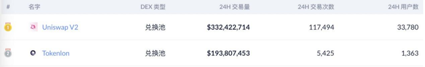 自Tokenlon开启创世挖矿以来,其交易量实现指数级增长,Tokenlon的24小时交易量最高突破3亿美元,成功超越Sushiswap位居DEX第二位。